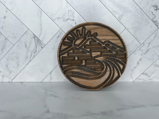 Round Trivet with Mountains & Ocean Waves, Serving Tray, Wood Trivet for Dining Table, Dining Accessories, Wood Gifts, Hot Tray, Pot Holder