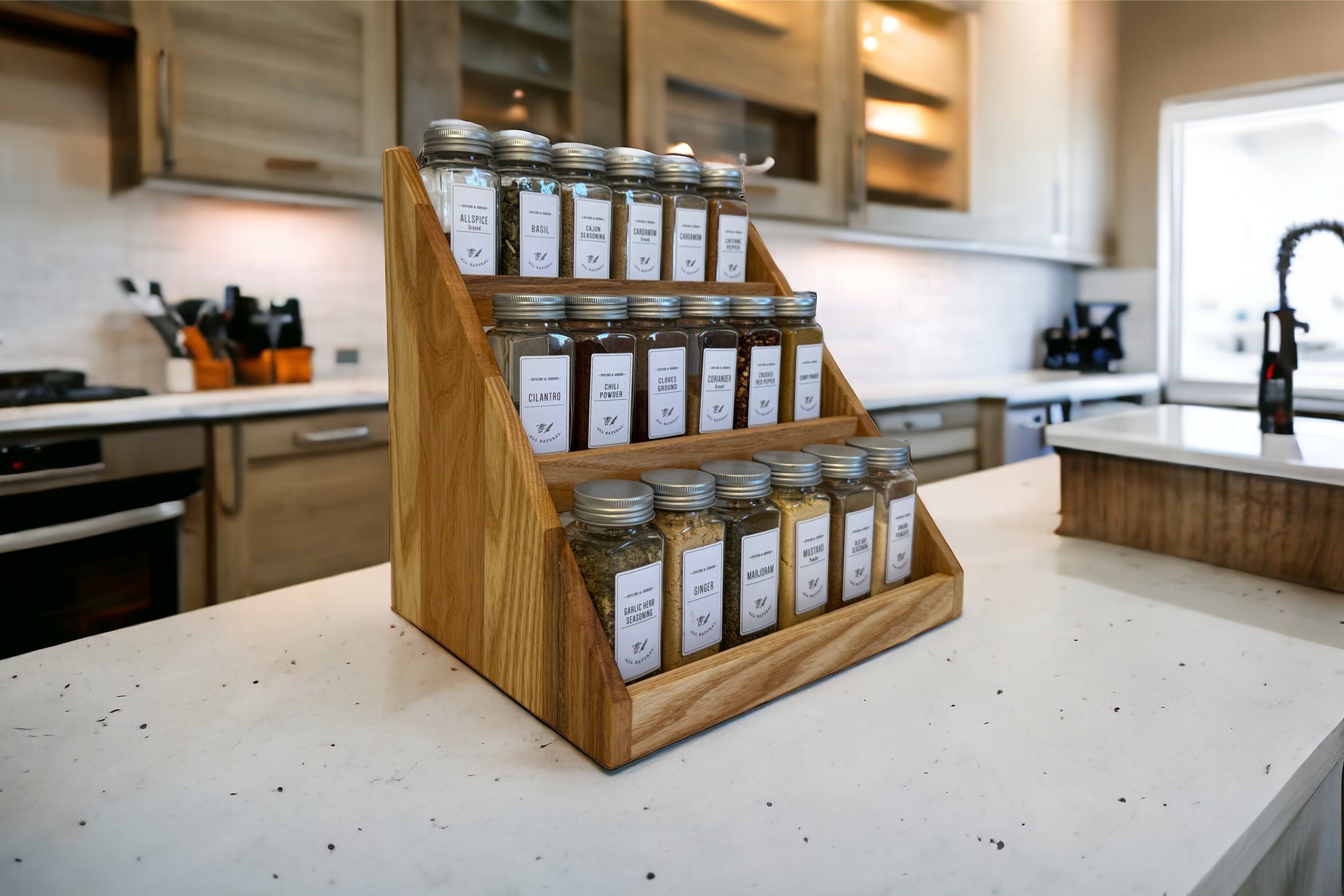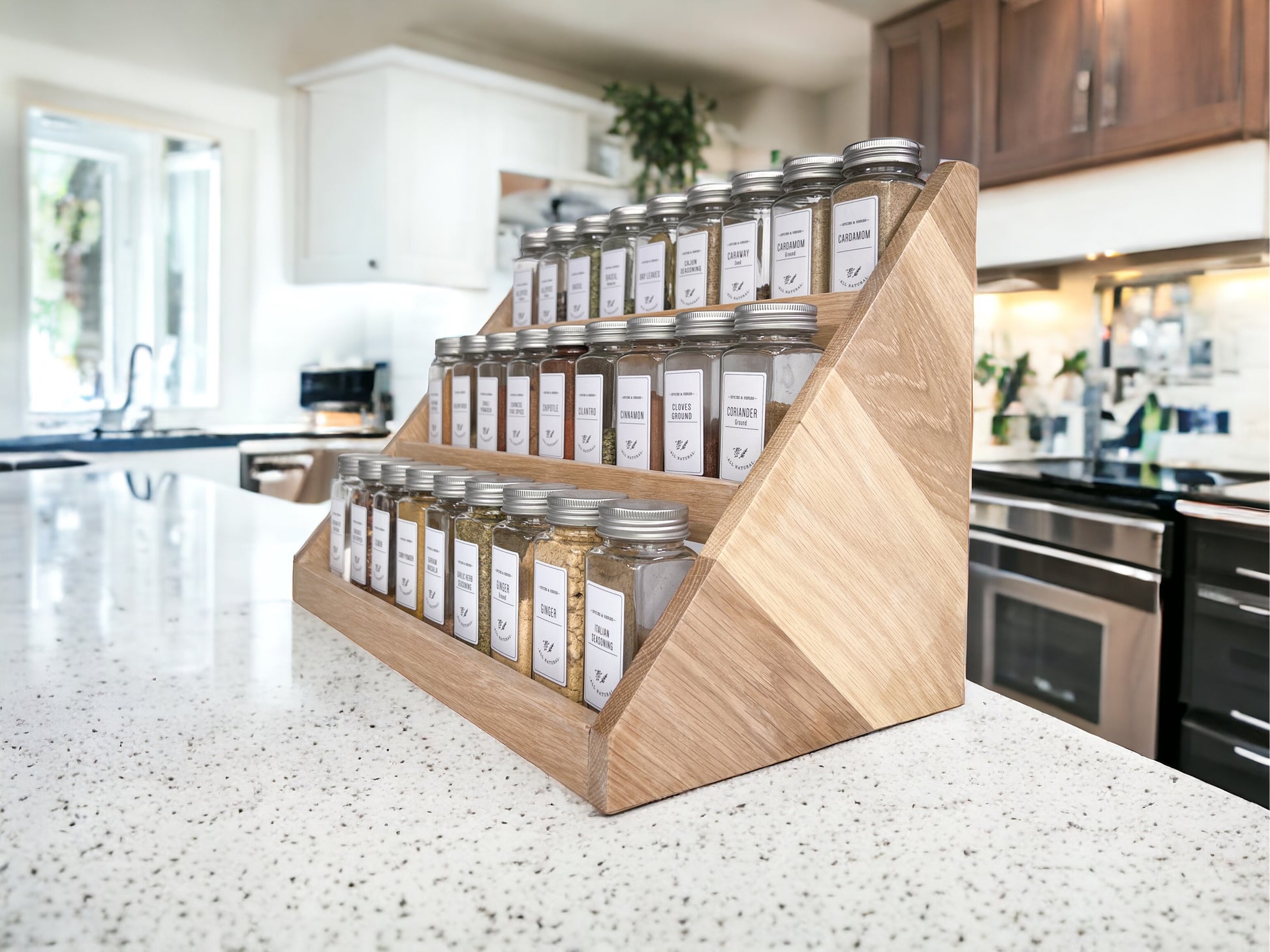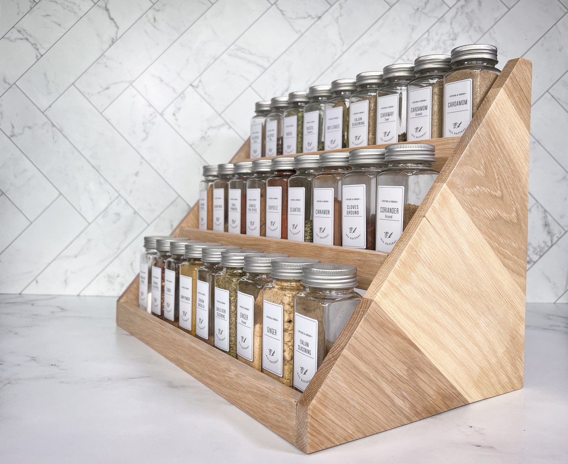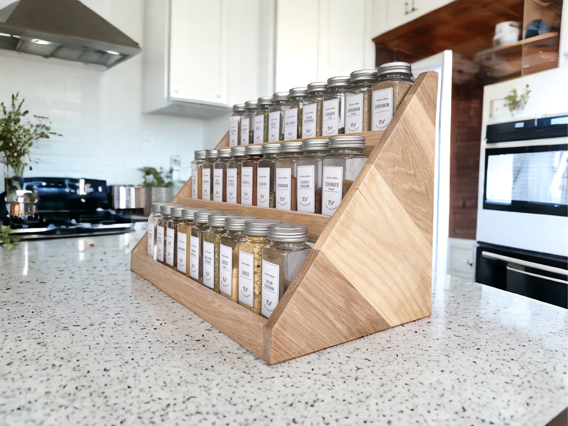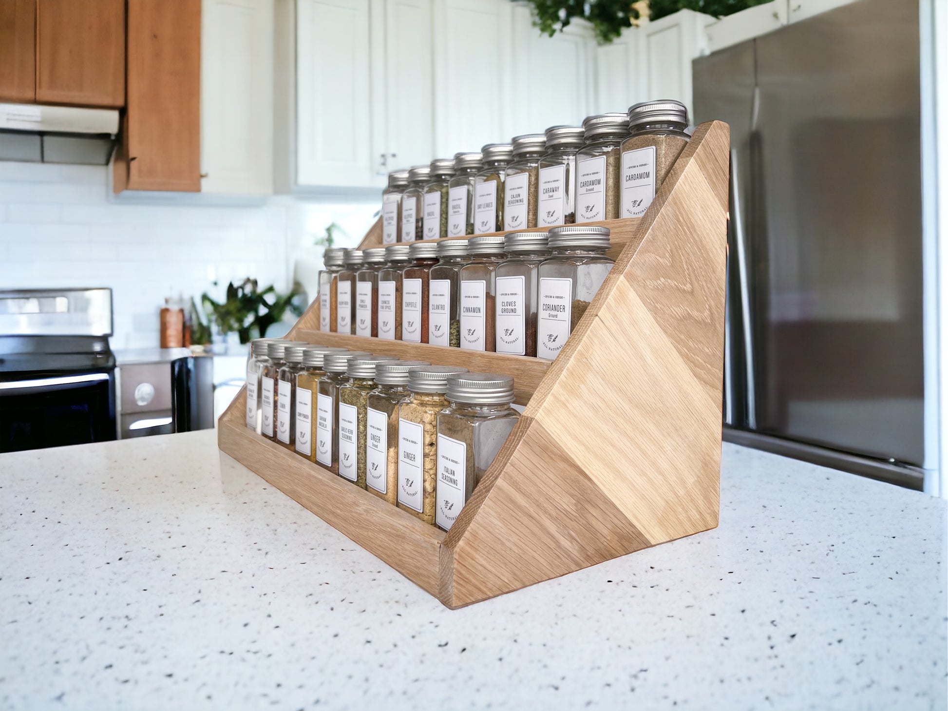 Our spice rack is handmade from hardwood and beautifully crafted for form and function in your kitchen. It is a great way to declutter your countertops while having an aesthetic presence and easy access to your spices.