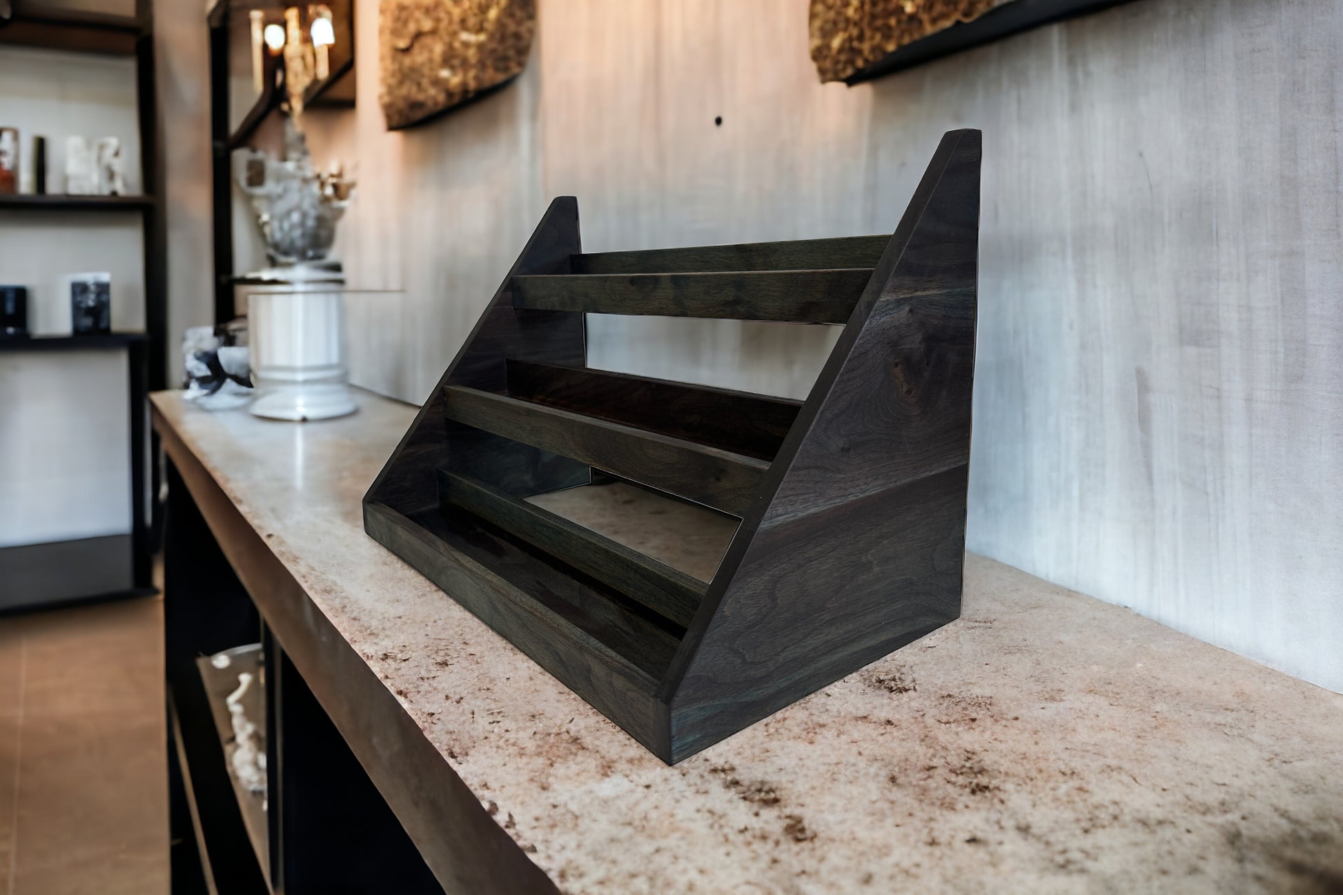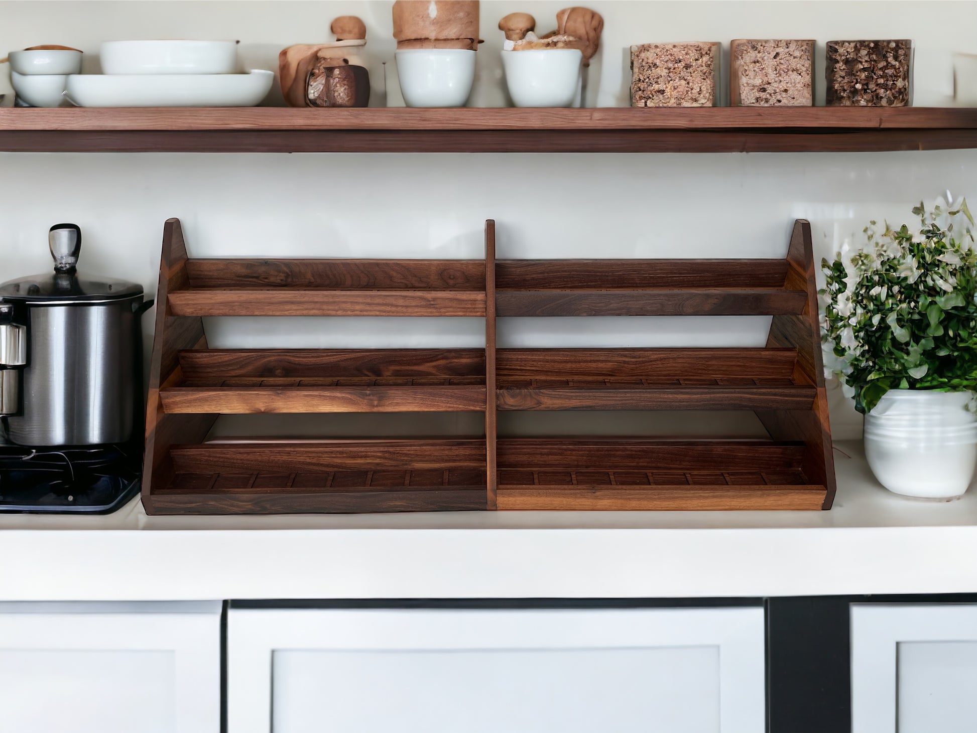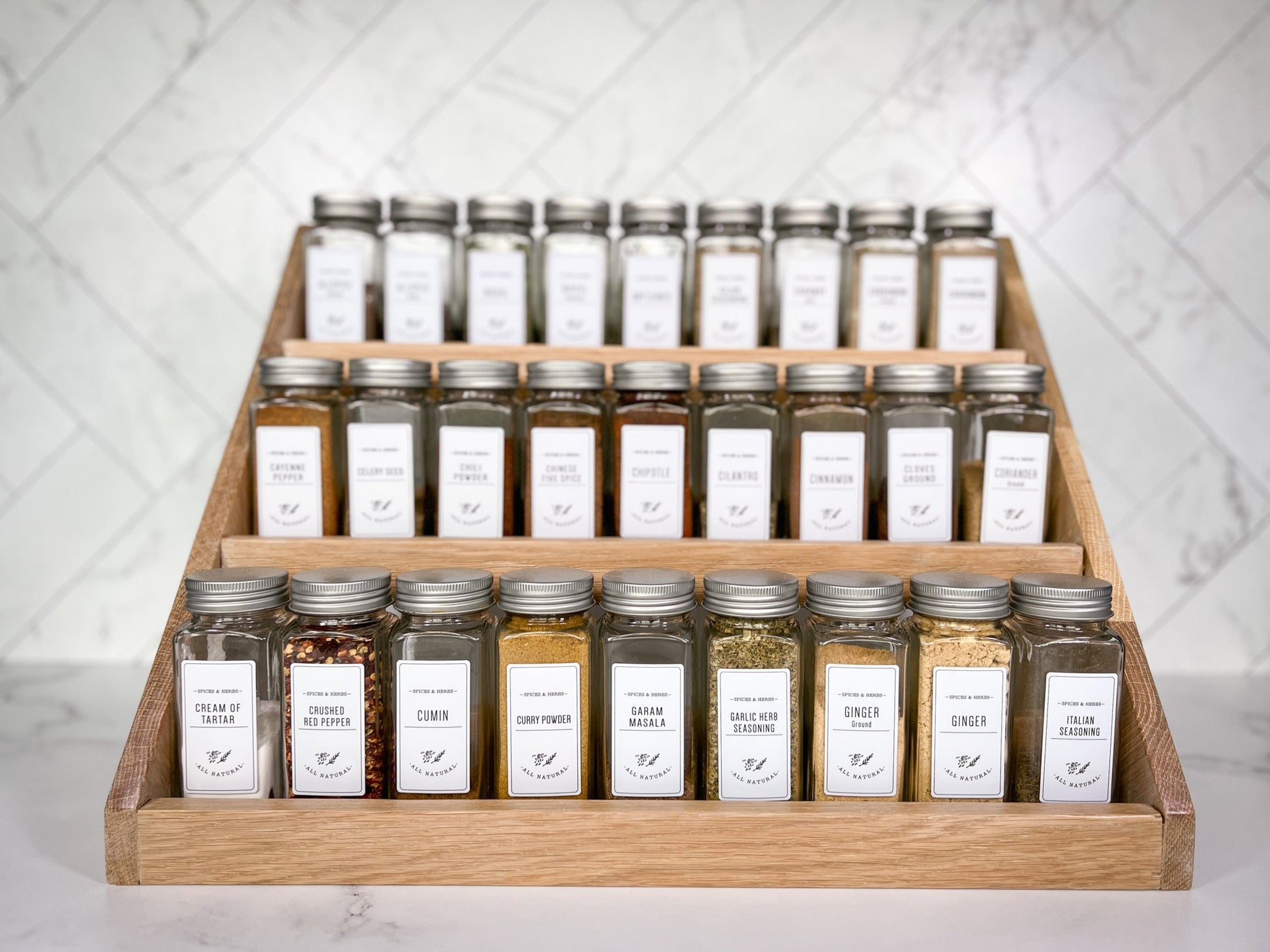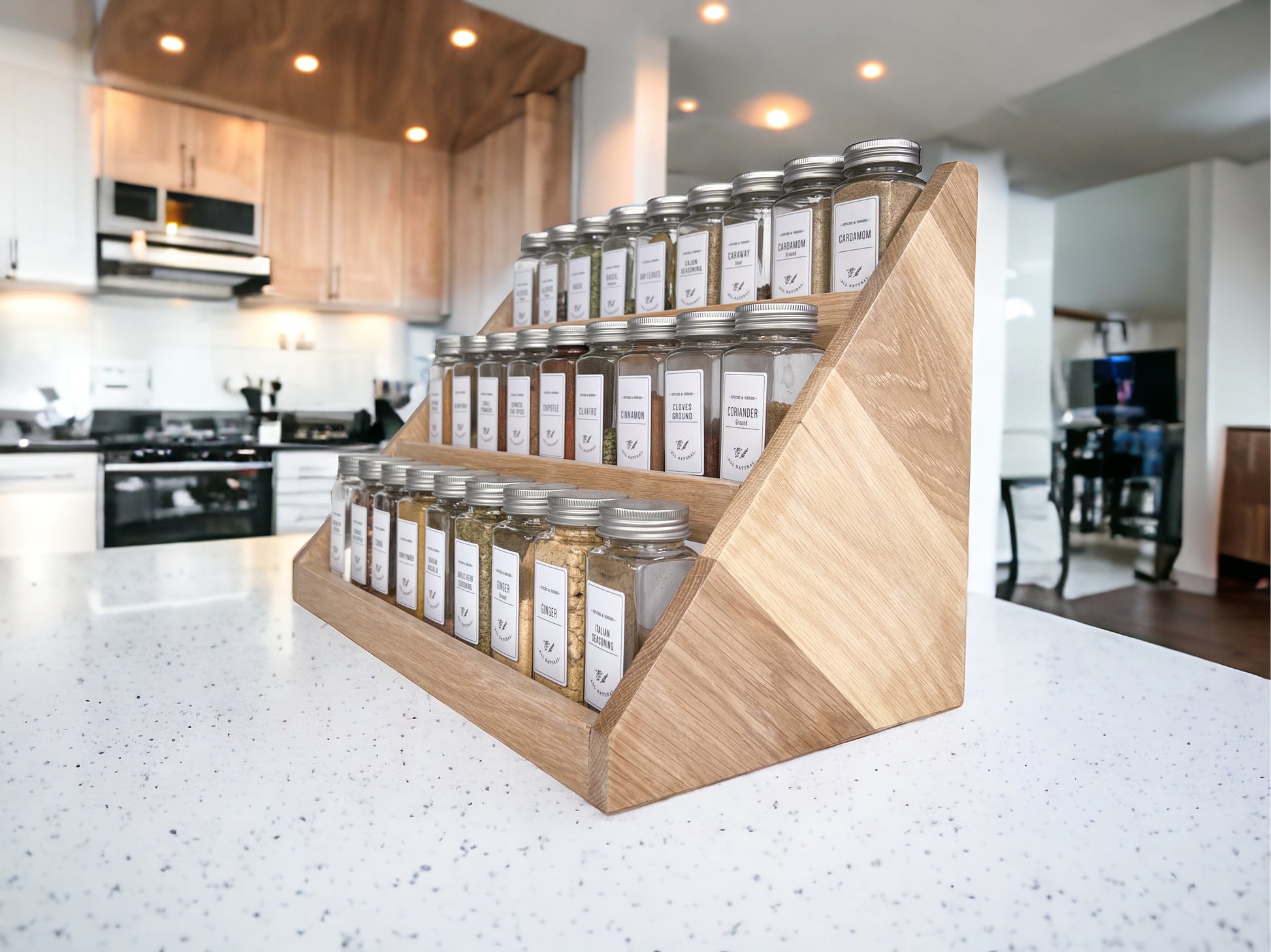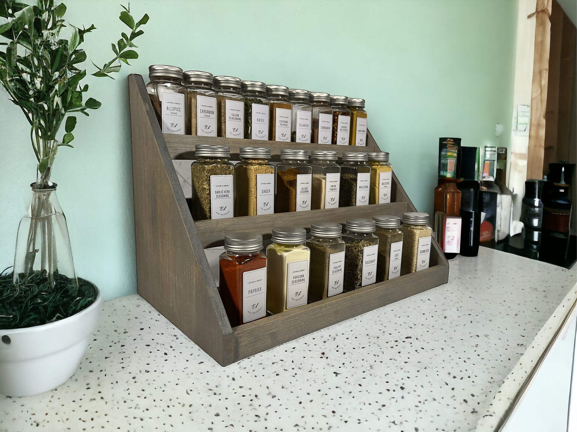 Our spice rack is handmade from hardwood and beautifully crafted for form and function in your kitchen. It is a great way to declutter your countertops while having an aesthetic presence and easy access to your spices.
